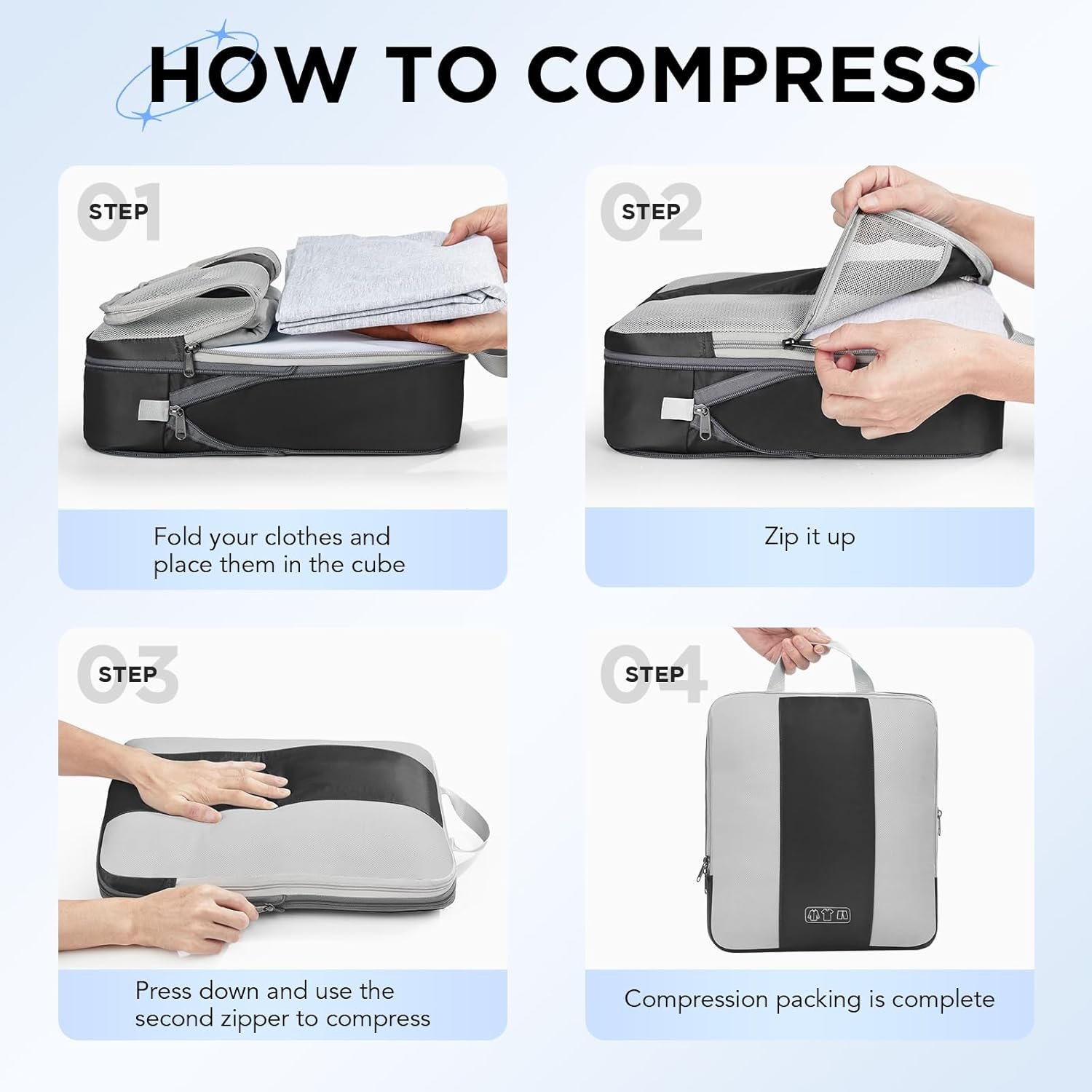 Maximize Packing Efficiency – Make every inch of your luggage count! These compression cubes work like a mini vacuum sealer, using an extra outer zipper to reduce bulk and create more space. Pack more clothes without sacrificing options—your favorite outfits, now travel-ready.