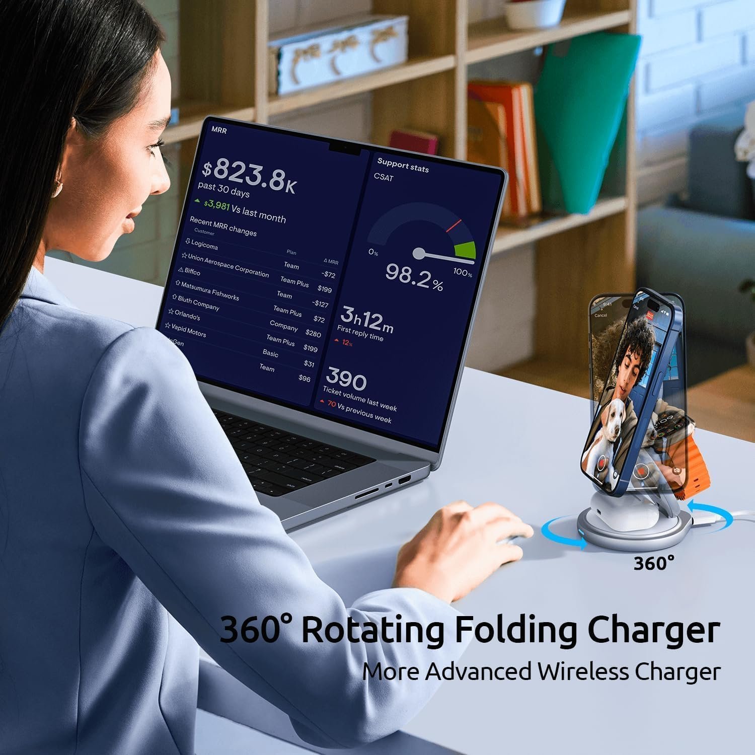 【360° Rotating & Portable Aluminum Alloy Charging Stand for Apple】Unlike other wireless charging stands, the plastic material of the charging station is upgraded to aluminum alloy. This enables the charger station to have better heat dissipation when charging. We also upgraded the base to allow 360° rotation. It allows you to easily turn your iphone without the hassle of moving the entire charging device.