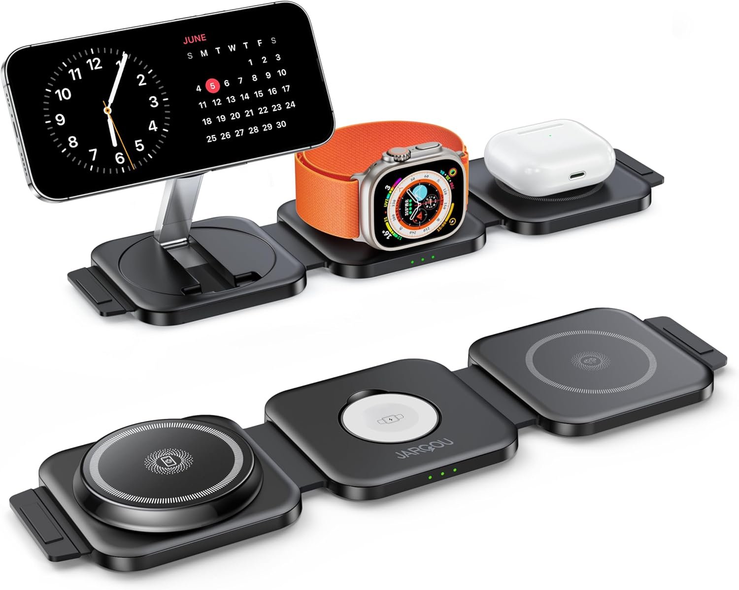 What is: It’s a foldable, small, travelable, travel charger station! JARGOU charging station can charge for iPhone, for Apple watch, and for AirPods at the same time, charger station is simply a little helper to keep the desktop tidy! Exclusively designed for Apple fans