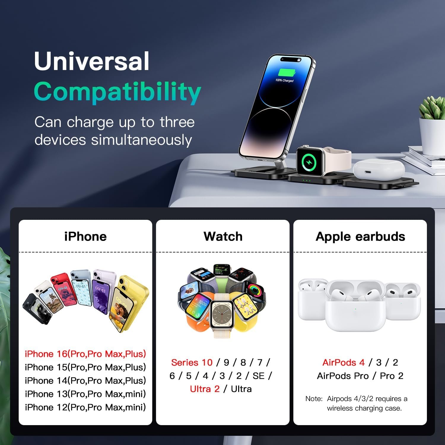 Compatible models: JARGOU 3 in 1 charging station is compatible for iPhone 16/15/14/13/12 series, for iWatch series 10/9/8/7/6/5/4/3/2/Ultra/Ultra2/SE, for AirPods 4/3/2/Pro/Pro 2. The magnetic attraction function is only for iPhone 16-12 series