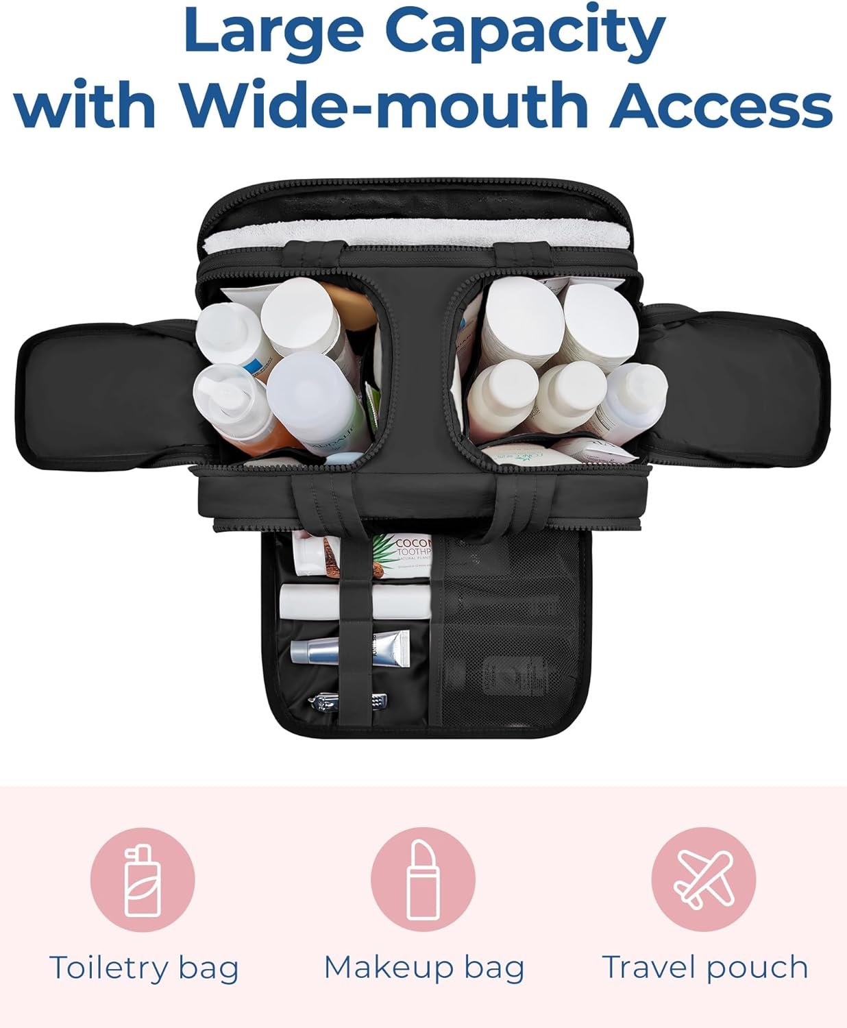 Easy Access and Keep Upright : Full opening and not piling up for easy access to items. Double side full open design of travel bag keeps cosmetic bottles and toiletries can stand upright in the middle compartment. Avoid leakage during transit