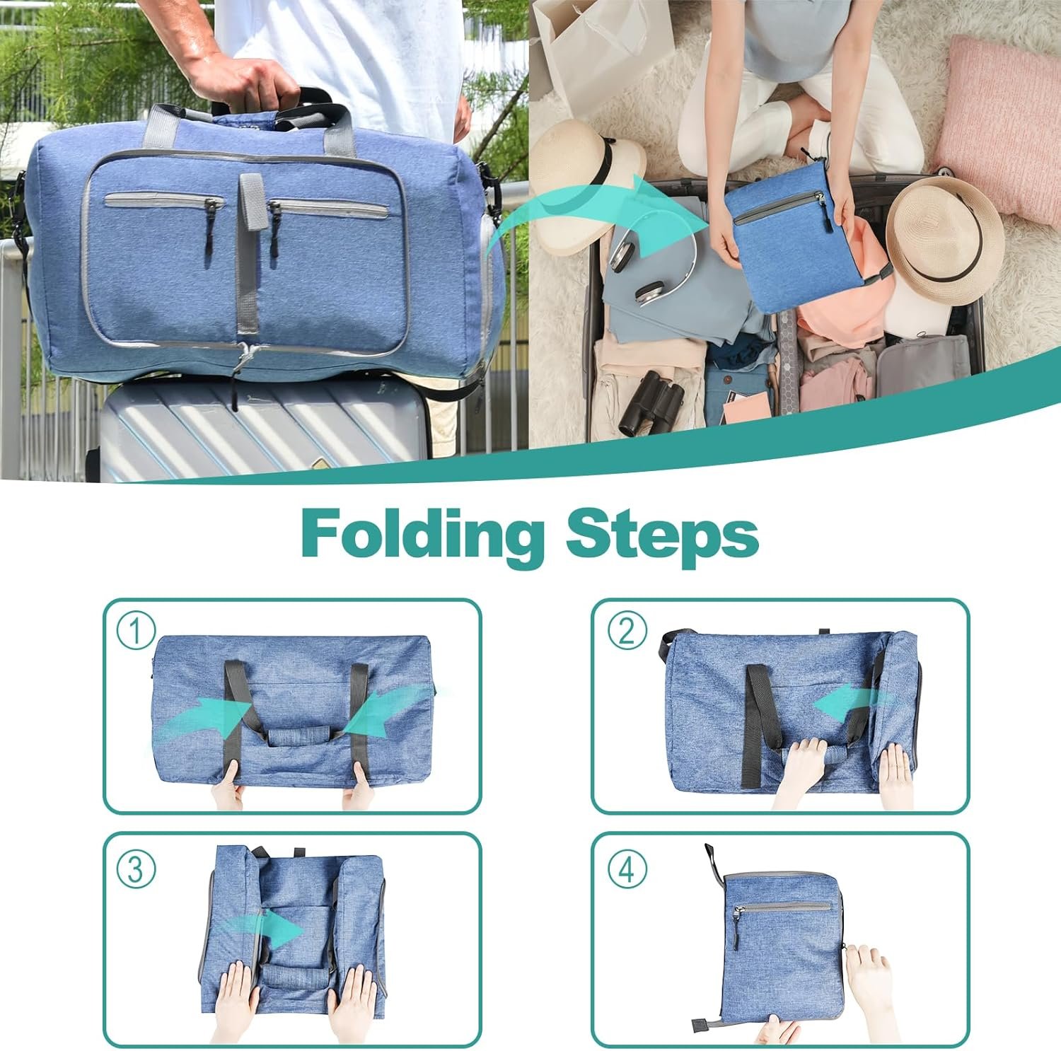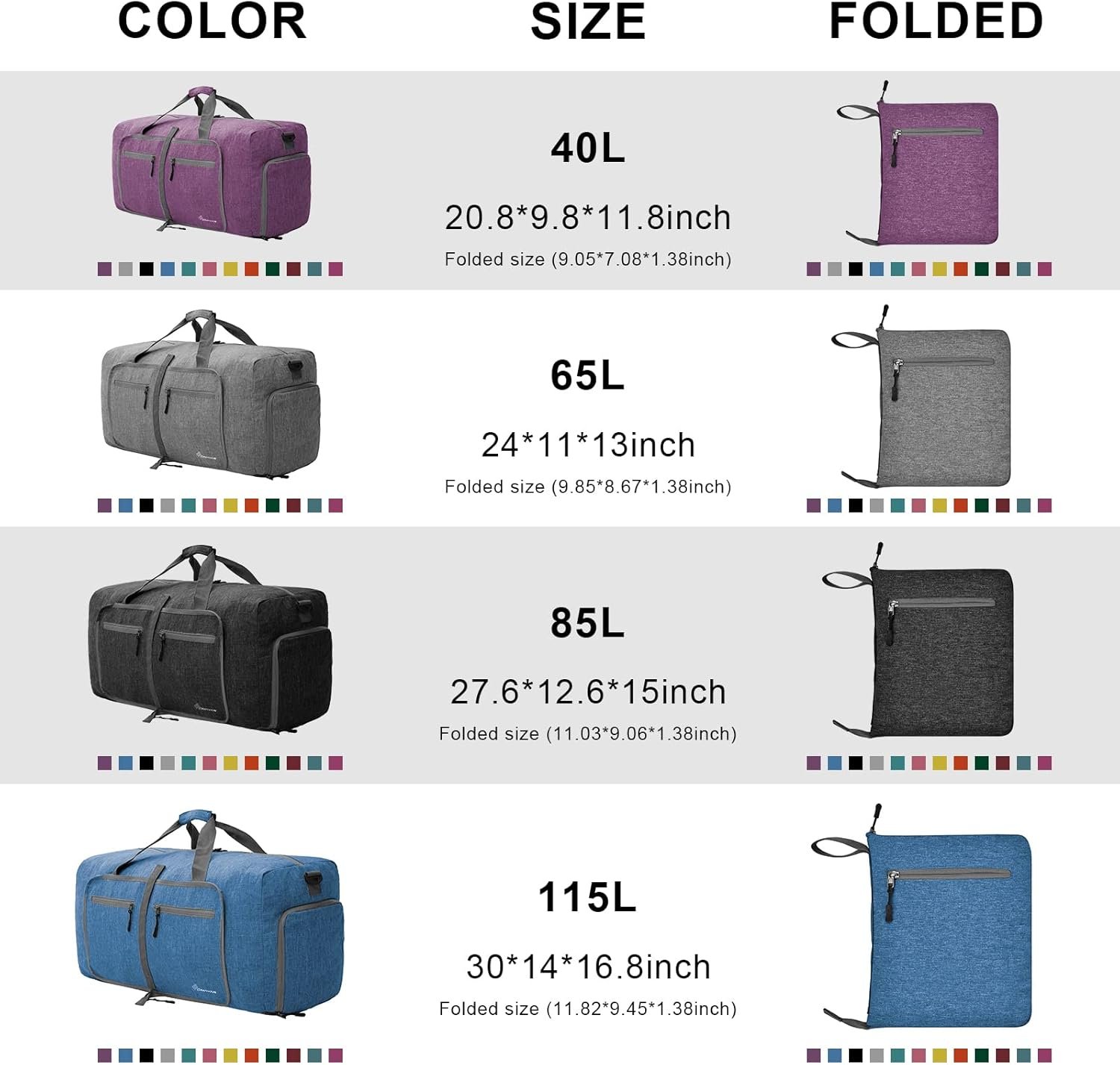Large Capacity duffel bag(Product Dimensions of unfolded size: 20.8″*9.64″*11.8″).Durable and Lightweight packable duffle bag:Made from water repellent& wear resistant&tear resistant heather polyester fabric and premium zippers, the large duffel bag super durable and lightweight. It weighs only 0.8 pounds and folded size only 8″*10″ which is very easy to store it.