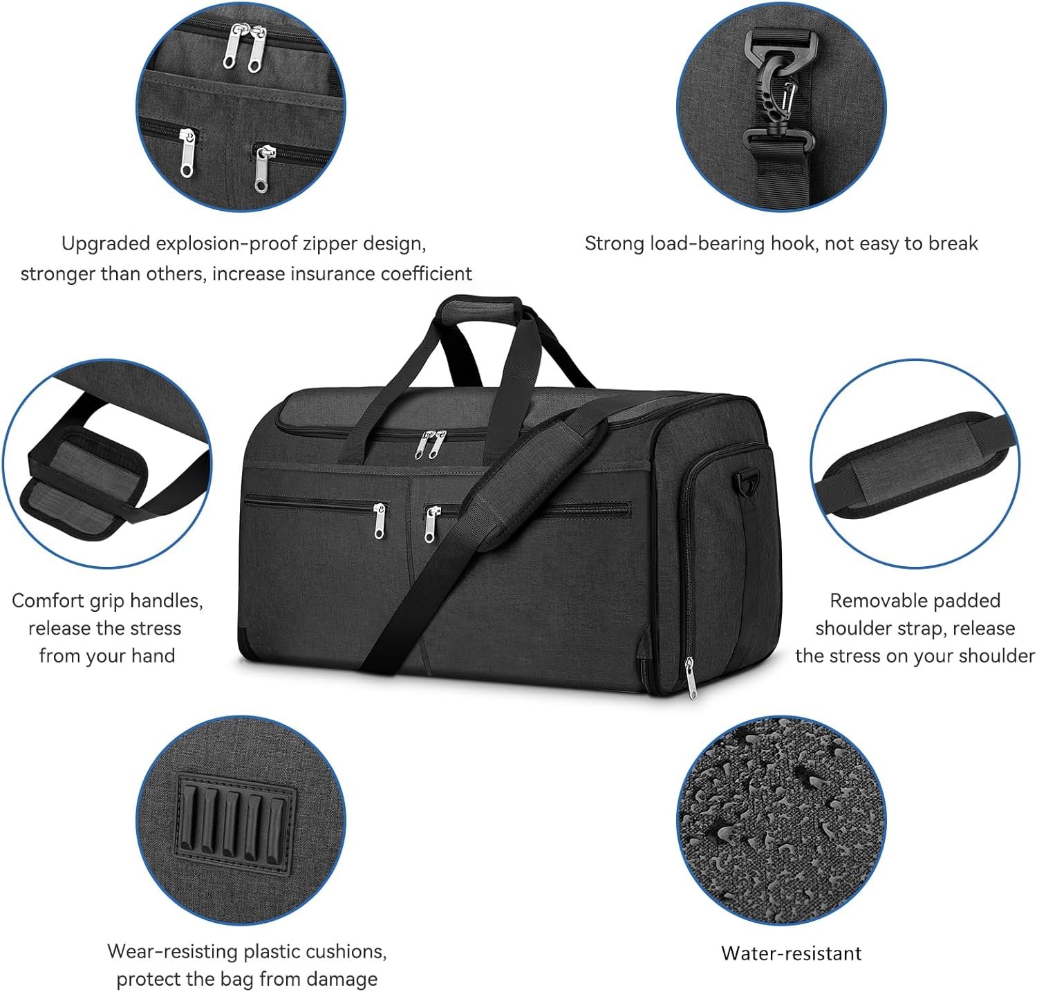 Easy to Carry: Short loop handles allow you to easily carry the garment travel bag through the airport or pull out the detachable and adjustable shoulder strap for travel, with the convenient bag strap that allows you to slide your duffel directly over the strap of your suitcase. (Note: the shoulder strap is packaged in the side pocket.)