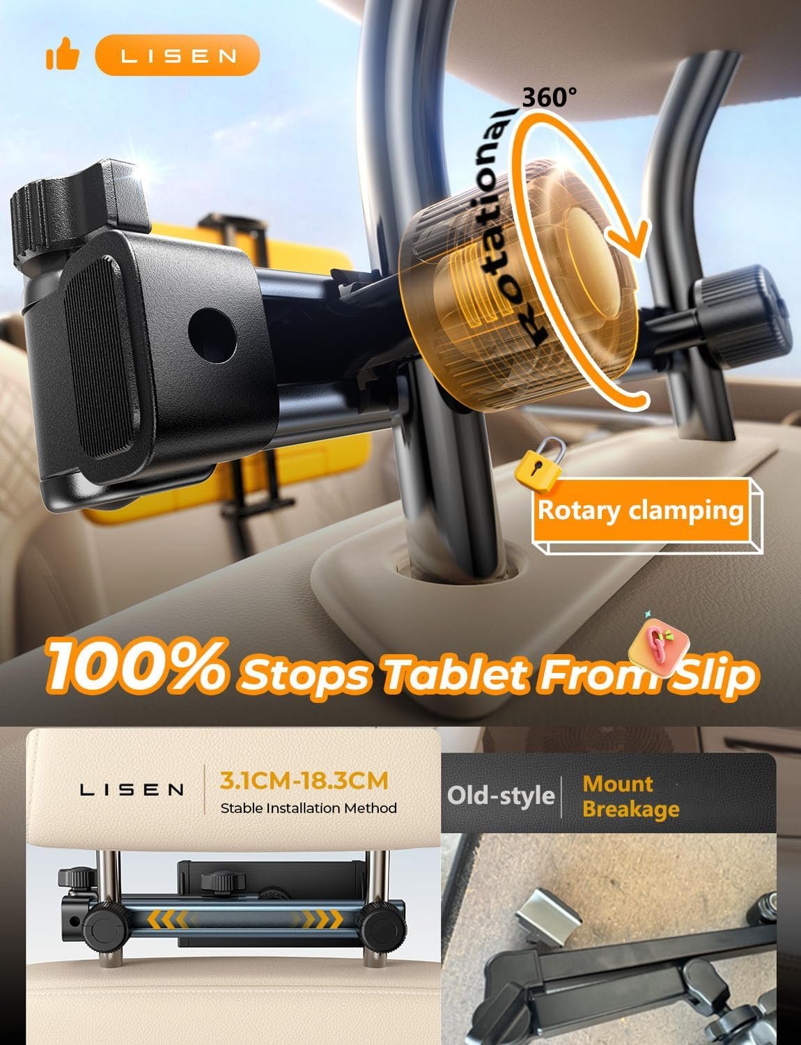 Sturdy & Safe reducing distractions for the driver, accesorios para carro ipad car mount hold tablet securely during bumps, fixed nut hook’s depth on both ends of the tablet car mount is deeper, increasing the 3X stability during driving. Works seamlessly with convertible car seats (rear-facing and forward-facing), making it a car accessory for kids aged 0-10 years