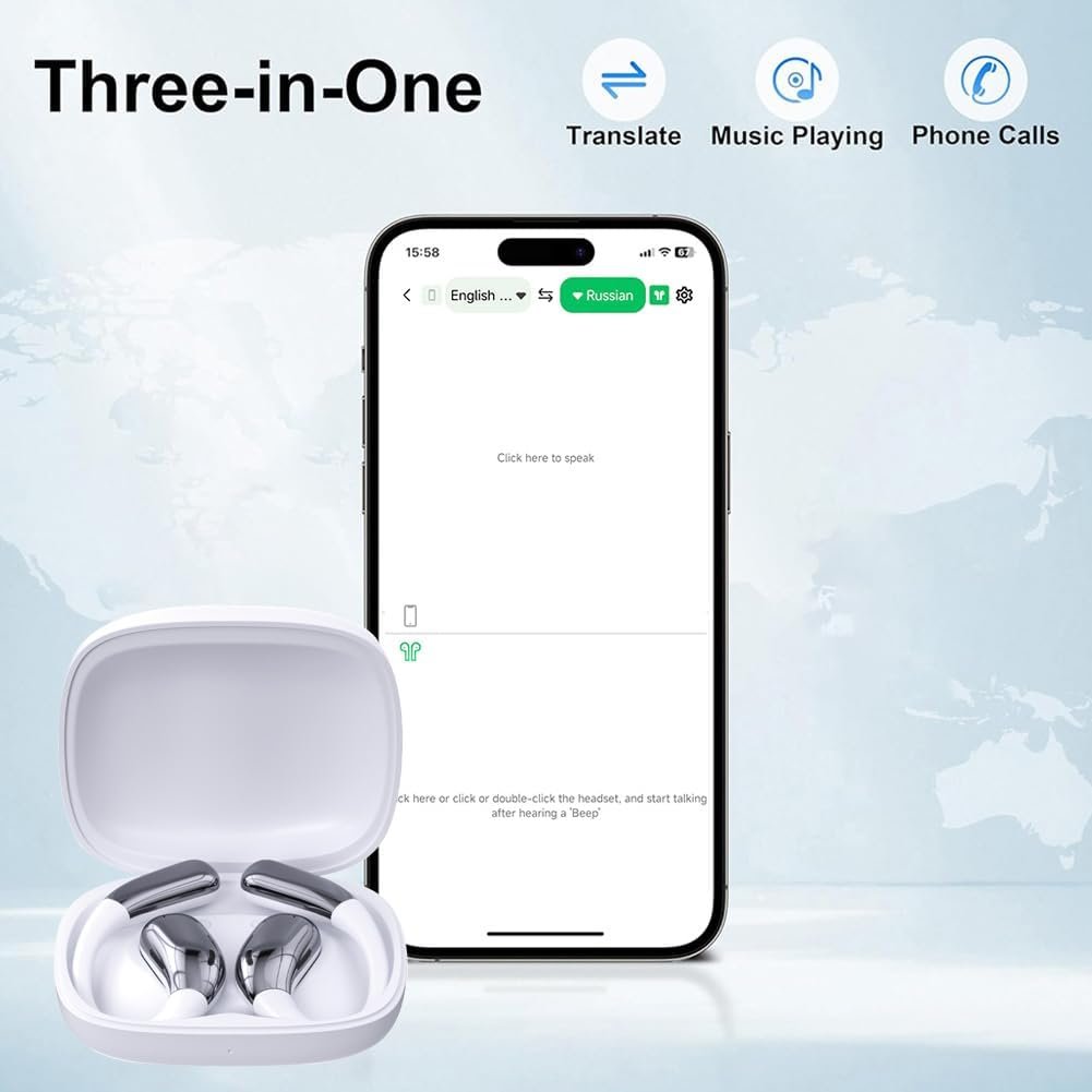 【Open Headphone Design】The translation earbuds real time adopt an open design with soft silicone ear hooks to ensure that they will not cause pressure or pain even if worn for a long time, and are easy to put on and take off.
